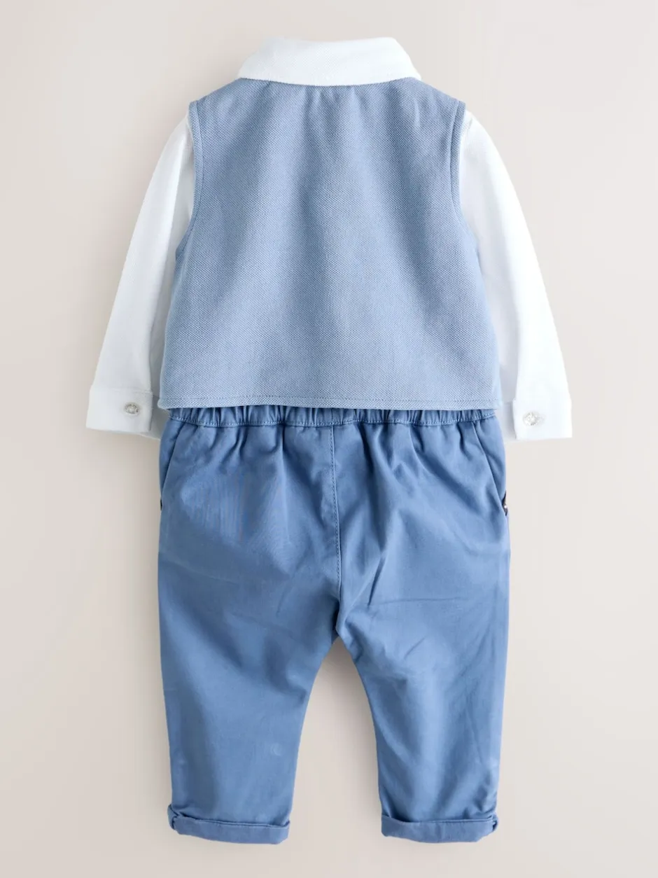 Haut barboteuse 100% coton. Bas 98% coton, 2% élasthanne. Gilet principal 100% coton. Doublure : 100% coton. Nœud papillon 100% Coton.