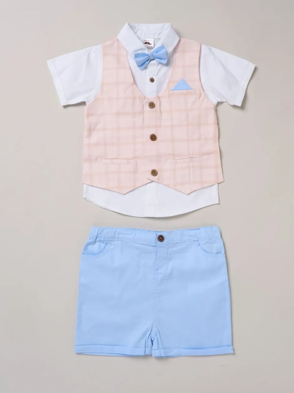 Little Gent Bleu – Chemise 100% coton avec gilet simulé et ensemble nœud papillon New
