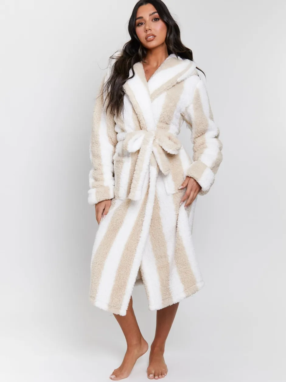 Loungeable Marron/blanc – Robe de chambre mi-longue à capuche à rayures sherpa épaisses Sale