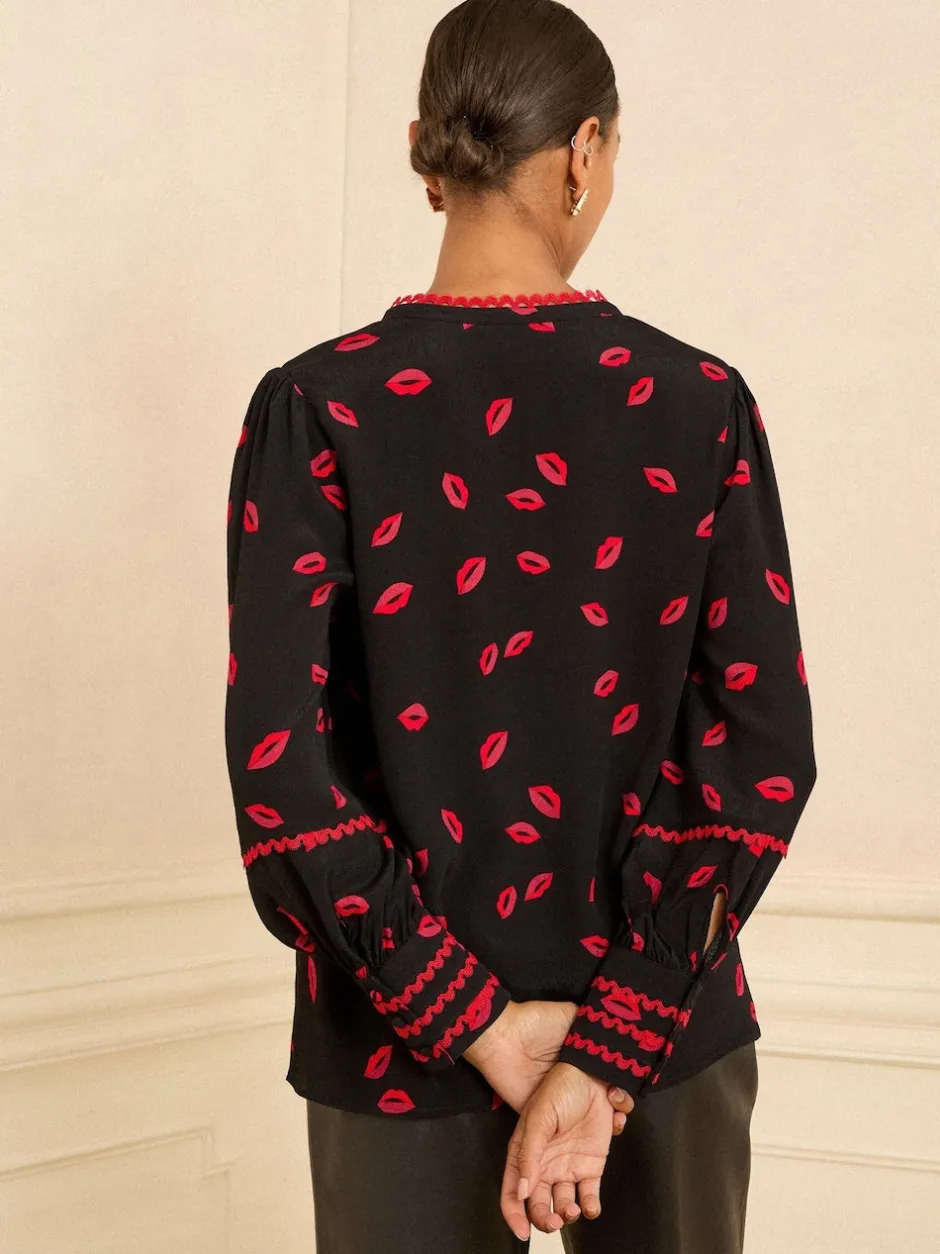 Love & Roses – Chemisier manches longues à col cranté Imprimé lèvres noires