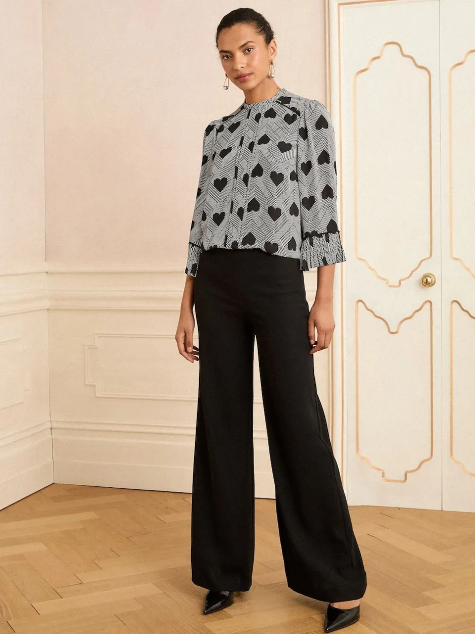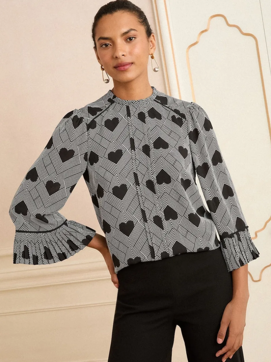 Love & Roses Gris imprimé cœur – Chemisier plissé à manches flûte à col rond Discount