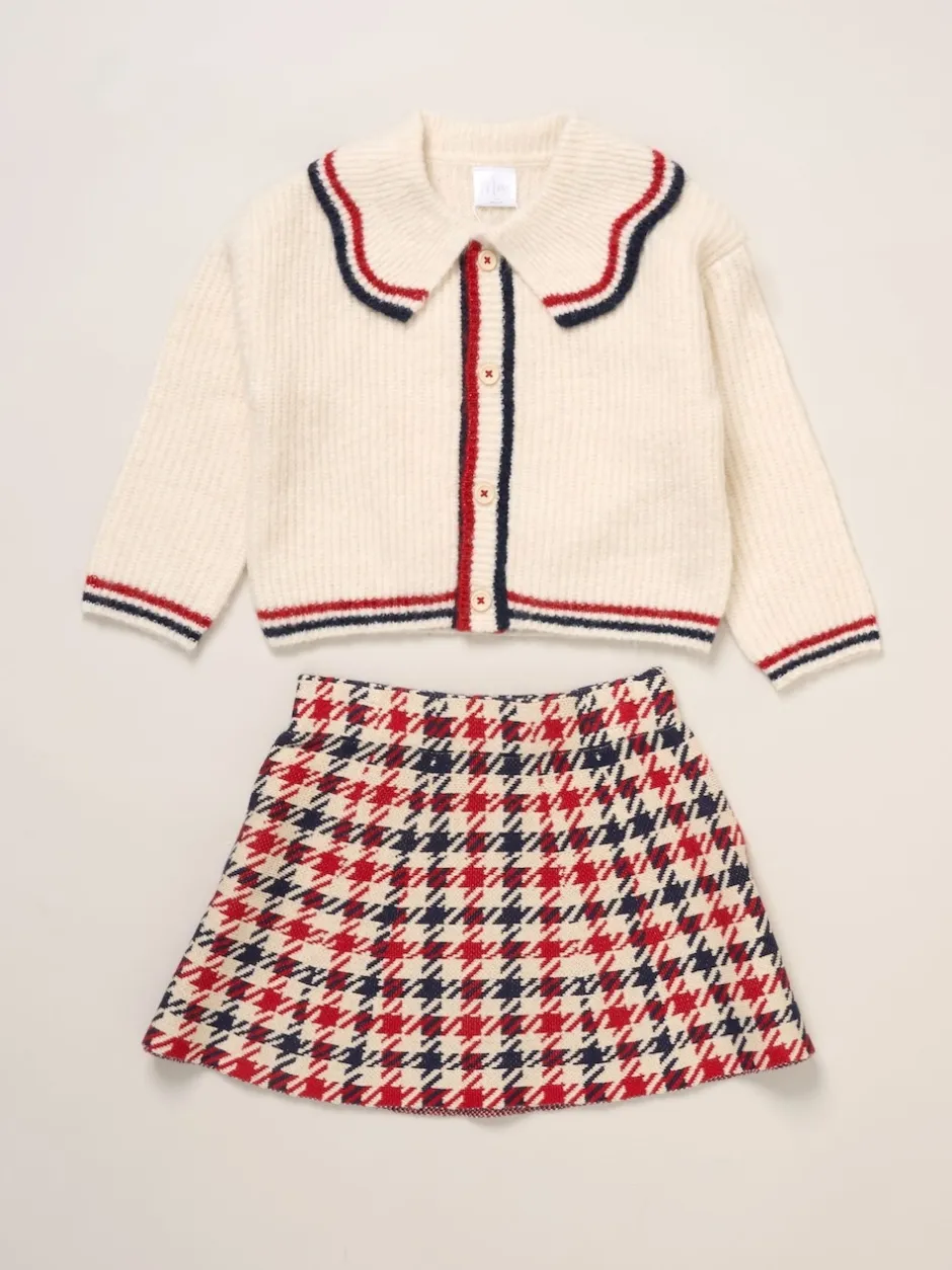 Miss Cardigan True Knit blanc avec jupe à carreaux
