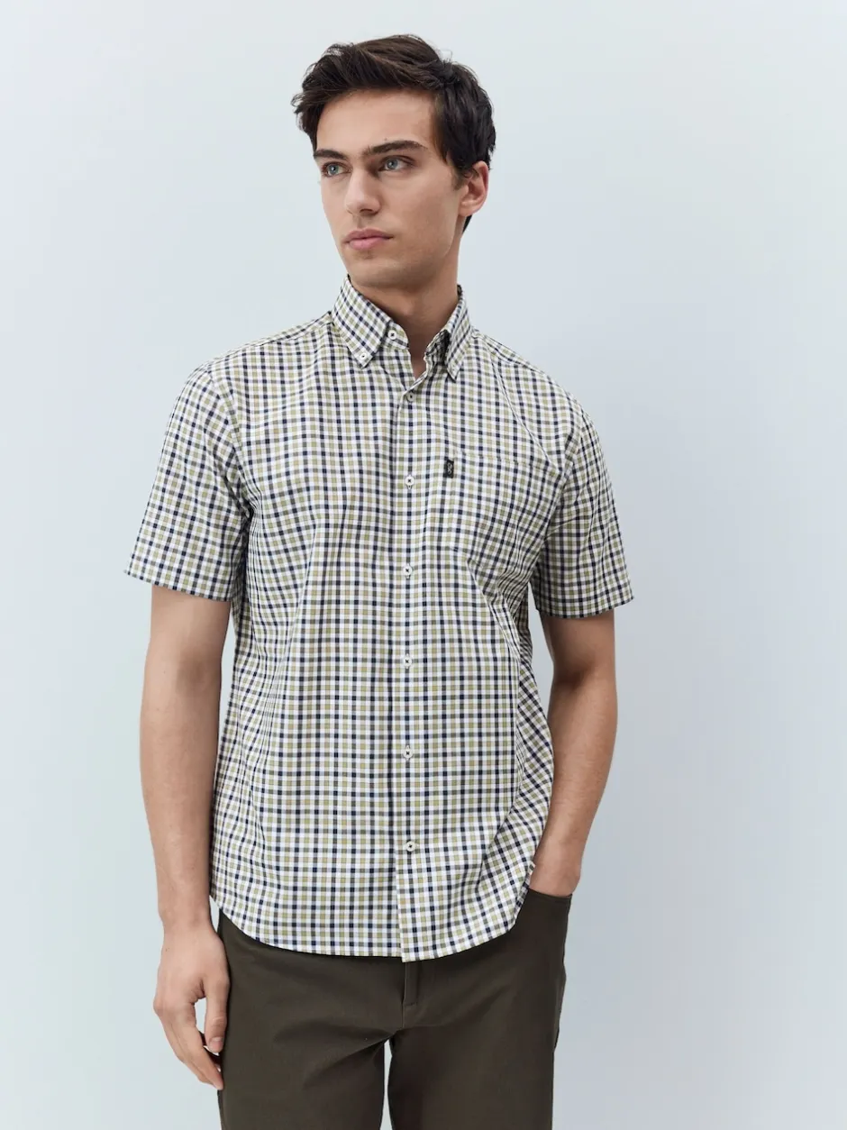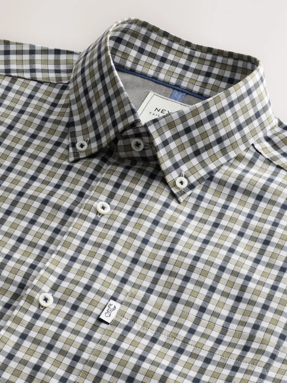 Next – Chemise Oxford Easy Iron boutonnée à manches courtes Carreaux Vichy bleu marine/neutre New