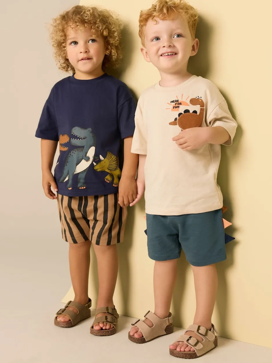 Lavable en machine. T-shirt bleu marine, T-shirt ciment, short Bleu Canard et short Rayure 100% coton.