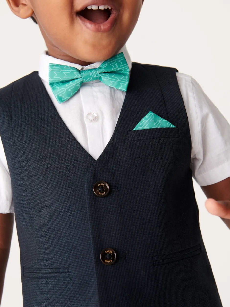 Chemise 100% coton. Gilet Main 78% Polyester, 22% Viscose. Doublure 100% Polyester. Short 78% Polyester, 22% Viscose. Nœud papillon 100% Polyester.