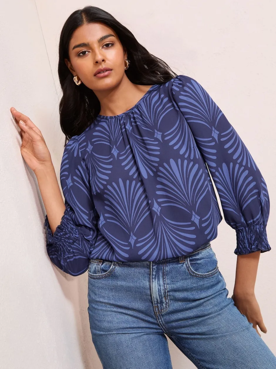 Friends Like These Bleu Fan Imprimé – Chemisier à manches froncées 3/4 Online
