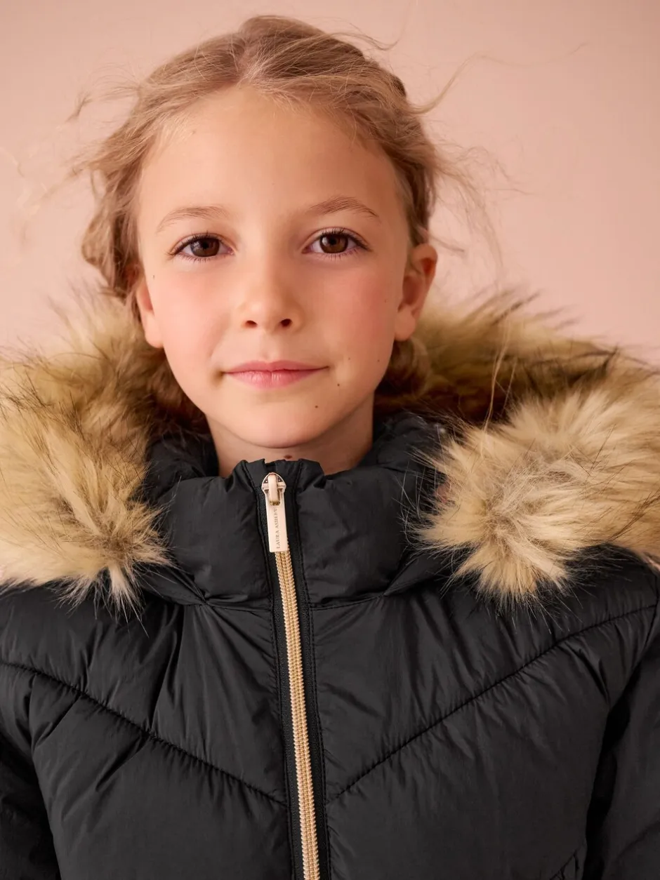 Lavable en machine. Coque 100% Nylon. Doublure du corps : 100% polyester. Doublure de la manche 100% de polyester. Fourrure artificielle 48% Modacrylique, 43% acrylique, 9% polyester. Ouate 100% polyester.