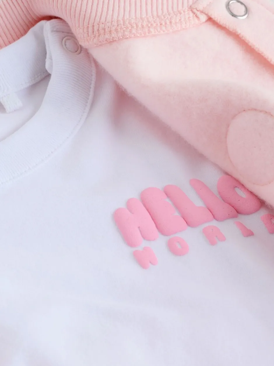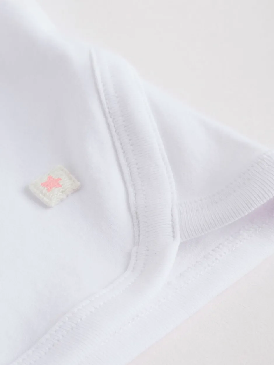 Lavable en machine. T-shirt 92% coton, 8% élasthanne. Leggings 95% coton, 5% élasthanne. Veste 80% coton, 20% polyester recyclé. Avertissement : tenir à l’écart du feu et des flammes.