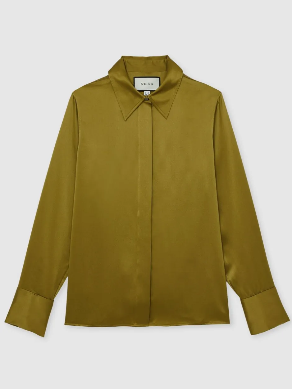 Reiss – Chemise Ameira à patte de boutonnage dissimulée en satin de soie Vert clair Clearance